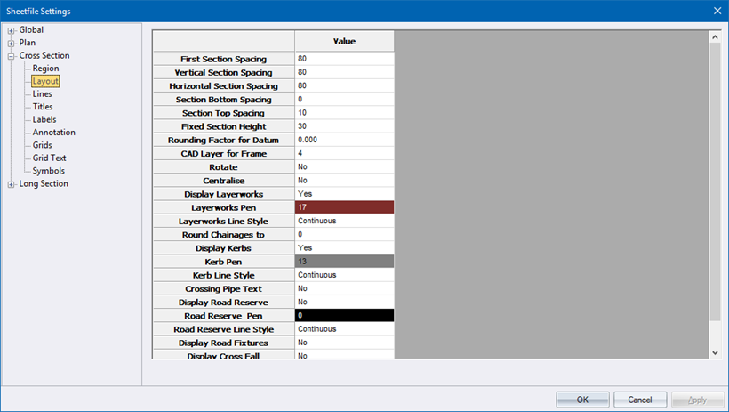 Specify whether the kerbs must be drawn on the cross-sections. Right-click on the cell to toggle the option. |
