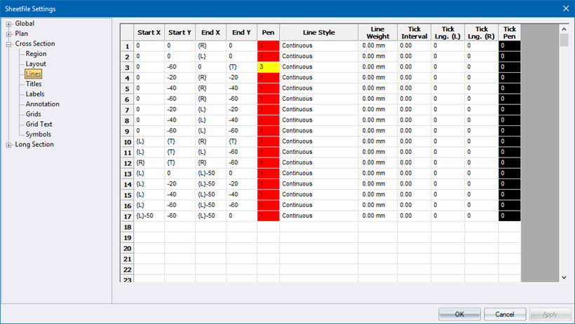 This sub-section defines the lines on the cross-section drawing area e.g. datum line, centre line (CL), border, etc.