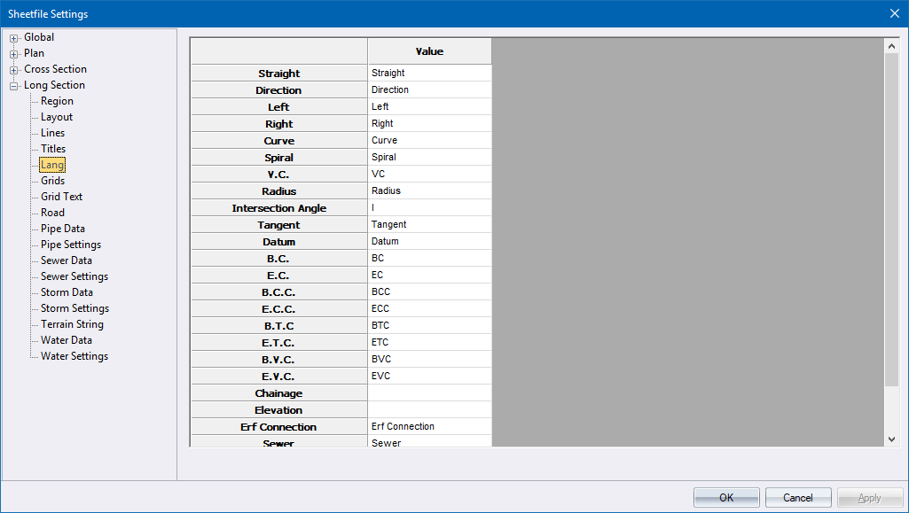 This page defines text substitutions for road element descriptions. Therefore, it allows you to customise the long sections to various languages.