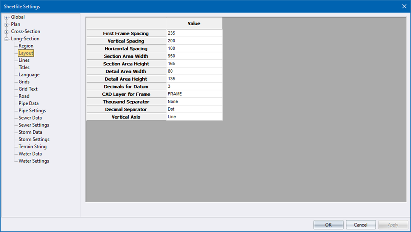 Enter the layer on which the long section frame should be drawn. |