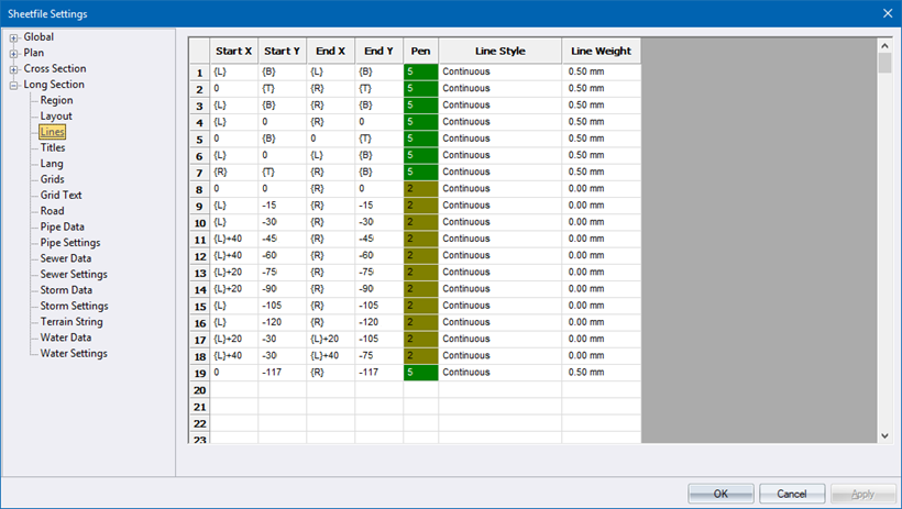 This page defines the lines which will be drawn on each long section. Typically these will be the lines defining the long section blocks.
