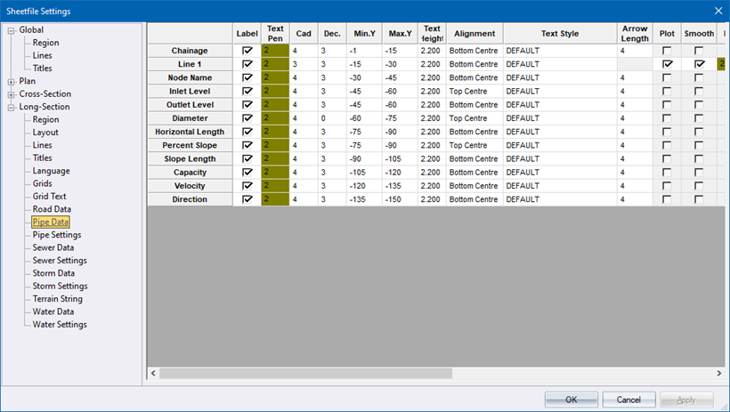 If you are creating a new sheetfile, there will be no pipe longsection data. In this case, you will not see the Pipe Data grid, instead you will see a Create Pipe Longsection Layout button.