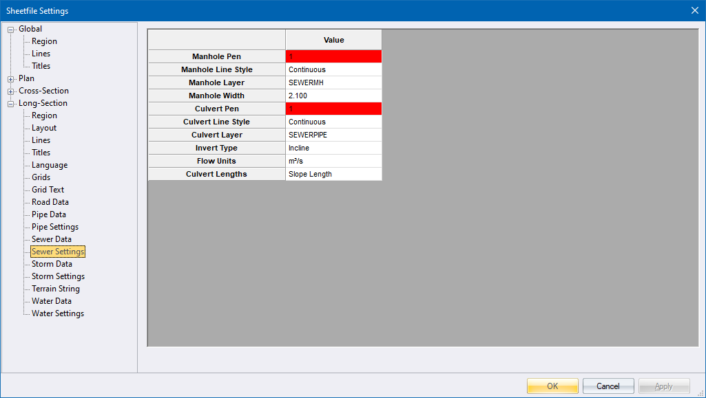 Select the pen in which to draw manholes. Right-click the cell to display the pen selection. |