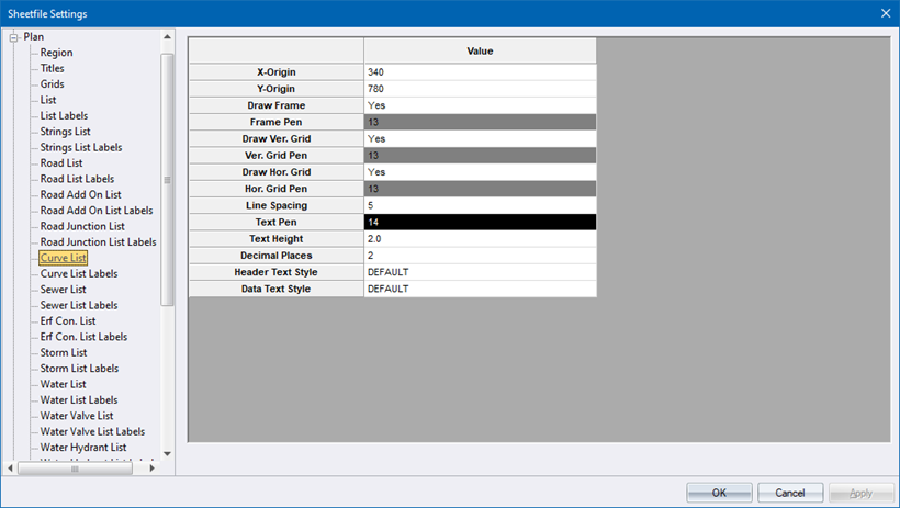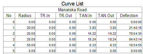 This section controls the detail of the road curve data on the plan. Note that the Curve listing routine will use the Language Settings, as specified in the Long Section - Lang tab.