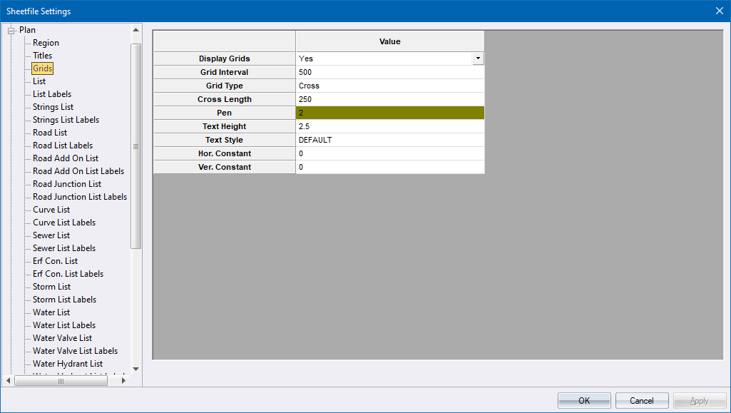 Specify the parameters for the grid that will be drawn on the plan portion of the sheet file.