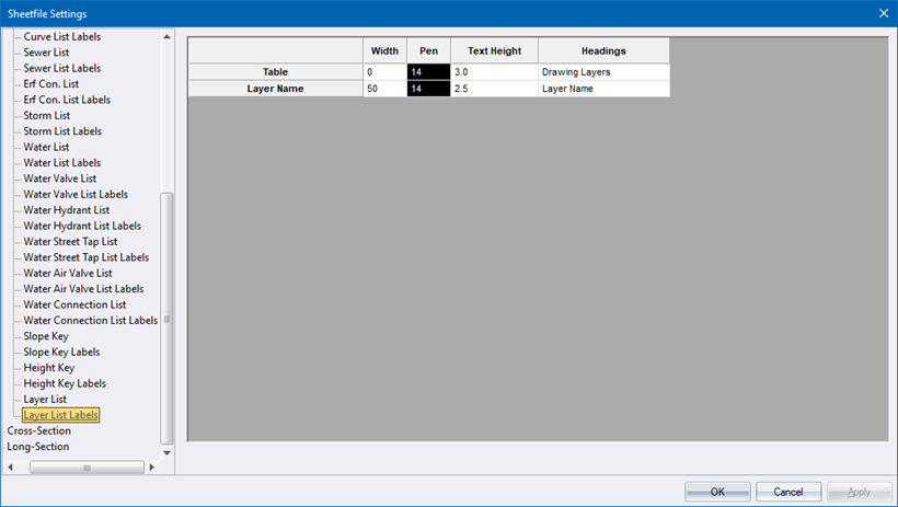 Select the pen in which the table or column heading should be drawn. Right-click the cell to display the pen selection. |