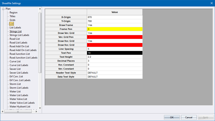 Select the pen in which to draw the list frame. Right-click the cell to display the pen selection. |
