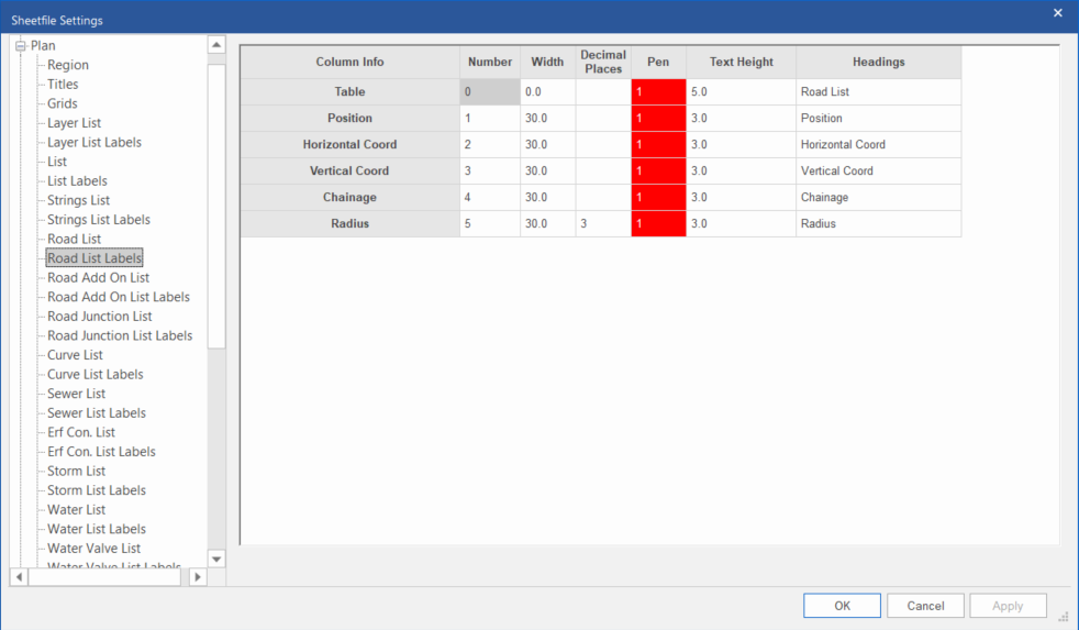 The number of decimal places for the plotted data in this column. Does not apply to some columns (for instance “Table”, and columns which show names/IDs). Note: If you specify decimal places here, it will override the “default” number of decimal places specified in the Plan -> Road List grid. |