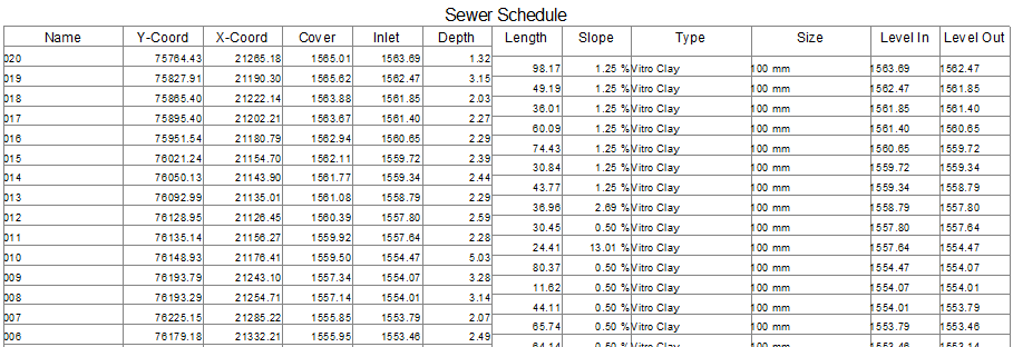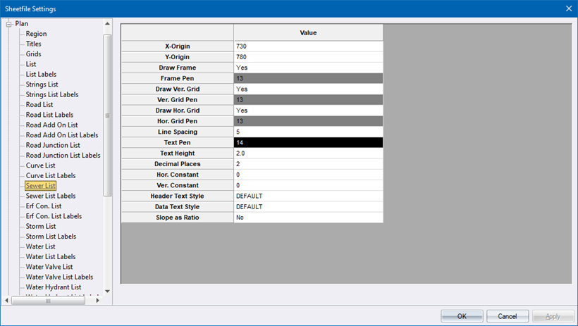 This page controls the drawing of a sewer schedule on the plan.