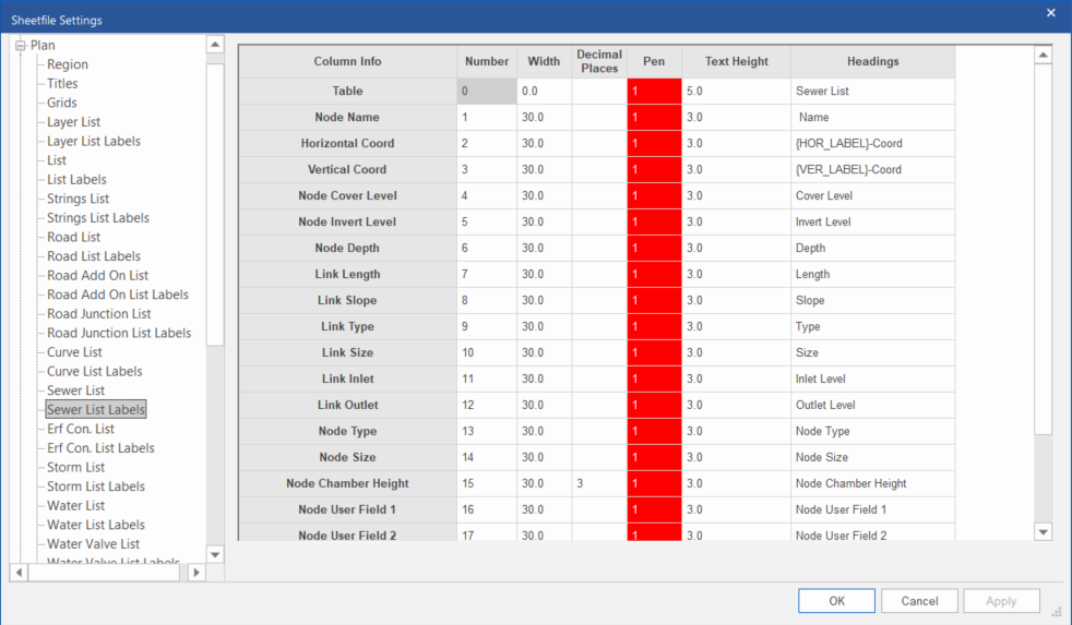 The number of decimal places for the plotted data in this column. Does not apply to some columns (for instance “Table”, and columns which show names/IDs). Note: If you specify decimal places here, it will override the “default” number of decimal places specified in the Plan -> Sewer List grid. |