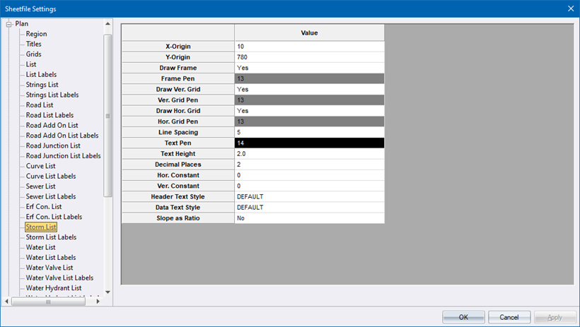 Select whether pipe slopes should be written as ratios (Yes) or as percentage slopes (No). Right-click the cell to toggle the state. |