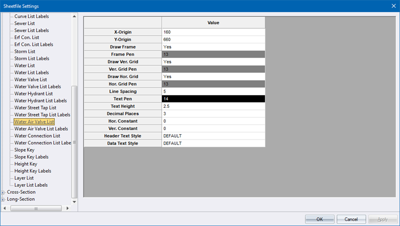 Select the pen in which to draw the list frame. Right-click the cell to display the pen selection. |