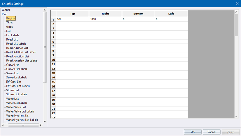 This section of the sheet file deals with the plan section of a sheet. The plan section can also include lists of road, sewer, storm and water data.