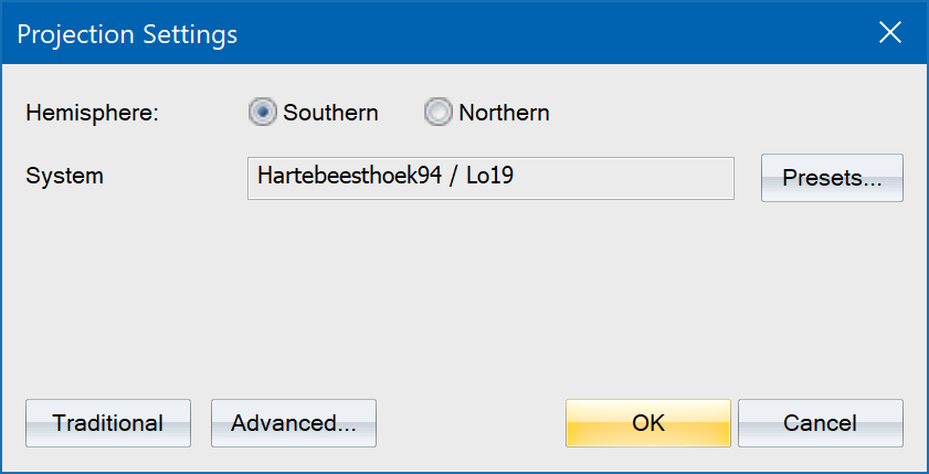 This option provides an alternative to specifying the traditional projection settings. In the Project Presets Dialog you can choose from various preset options that include all the needed projection settings without you knowing the details of them. When you select an option, the Project Settings dialog shows the chosen preset system option instead of the traditional settings. |