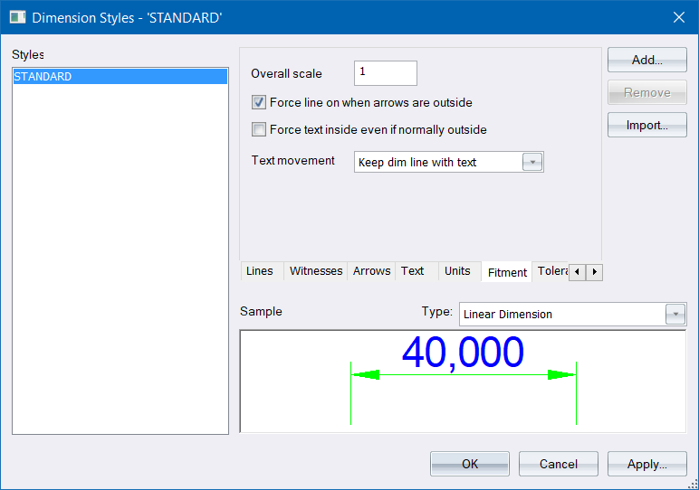 Enter the scale of the graphical elements in the dimension. This scale affects the text size, arrow size, gaps and spacings in the dimension. |