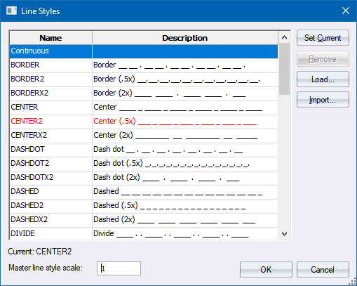 Load line styles from another line style file. The Line style Import options display. Three standard line style files are supplied: |