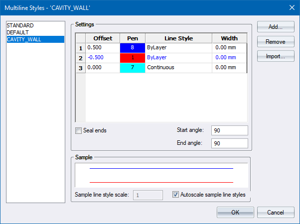 Use this window to manage the multiline styles in the drawing. Each row of the Settings grid represents one line in the multiline definition.