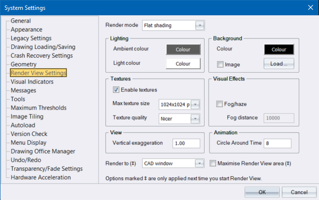Click to select a colour for the background of the rendered view. This colour is also used as the fog colour. |