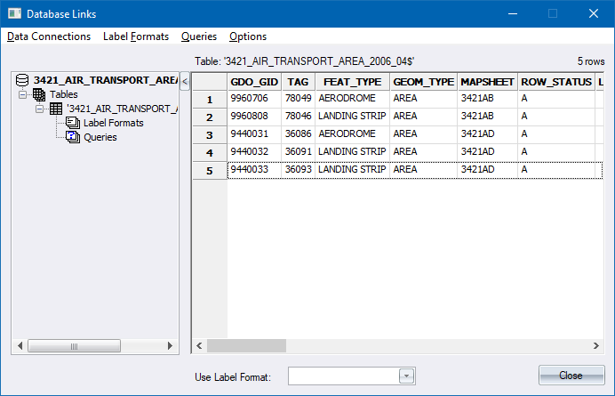 Displays details of the database connections in the current drawing. It is used to browse through the connections and the tables, queries, link filters and label formats assigned to them. Right-clicking on the various items displays a context menu of operations to perform with or on that item. |