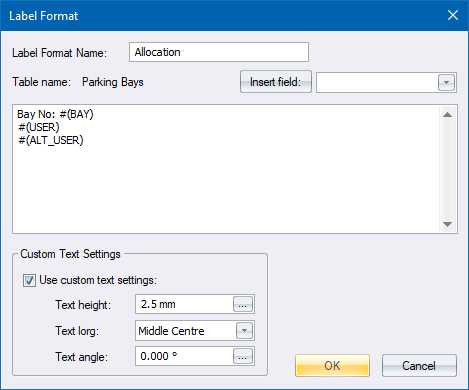 Select a field name from the associated table using the dropdown list and then click to insert a placeholder for the field in the label format at the current edit cursor position. |