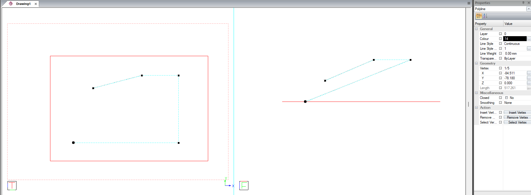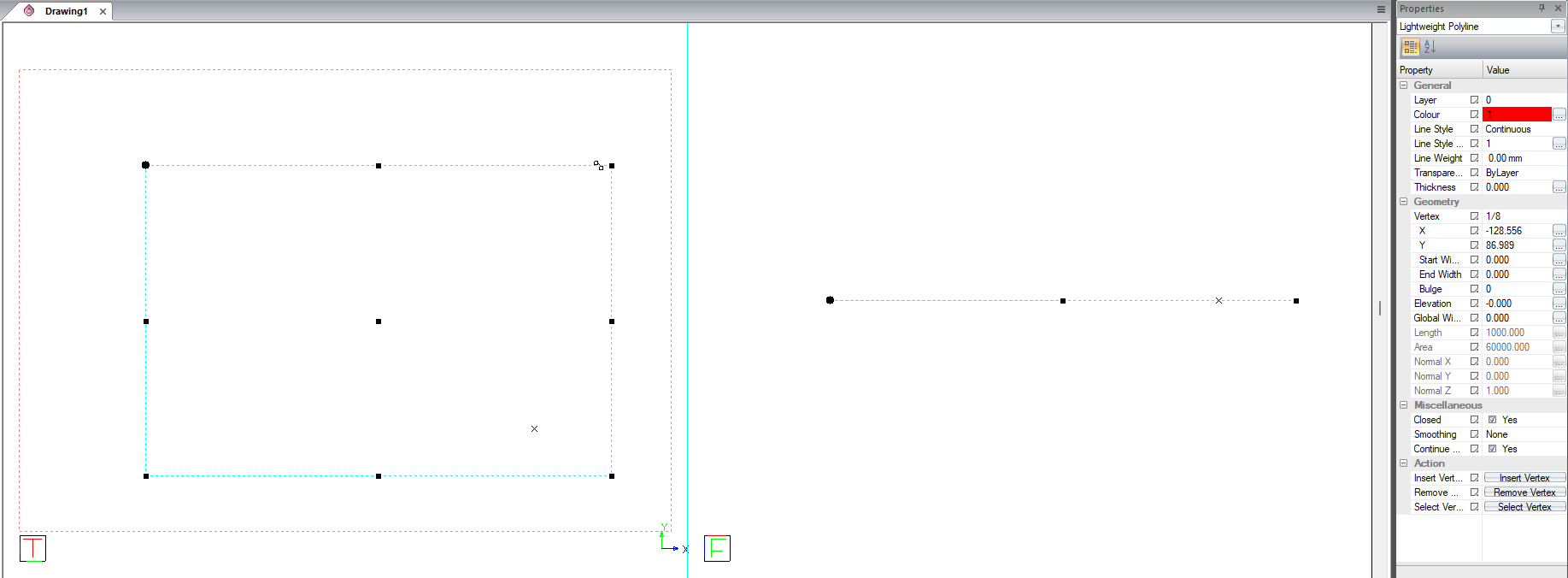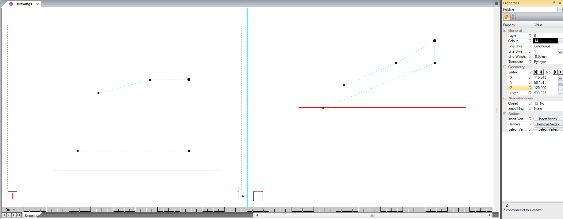 In this example, we have drawn the red rectangle to show the current drawing plane and better illustrate how the 3D polyline can be elevated. The red rectangle is drawn as a lightweight polyline, and if you look at its properties you can see that the X, Y and Z coordinates can't be changed.