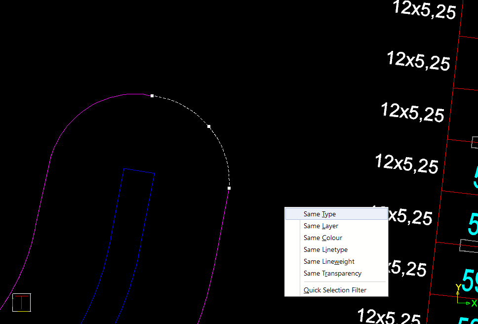 The Quick Selection Filter option will display the Quick Selection Filter dialog, pre-configured to select the currently selected entity type.