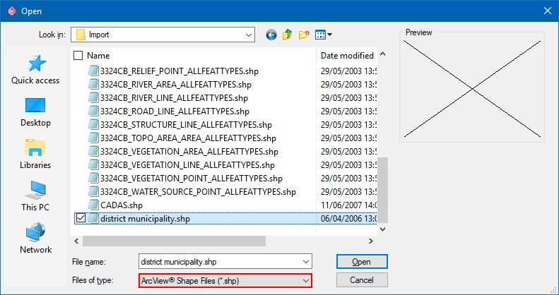 - Select the SHP file to be loaded from the Open options.