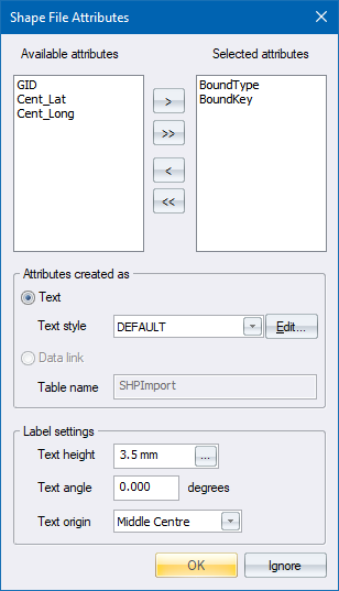 - Set up the drawing scale, units and paper size and click OK. A window displays allowing you to select which attributes to import, and if you want them to be displayed as text entities or to create a linked data file.