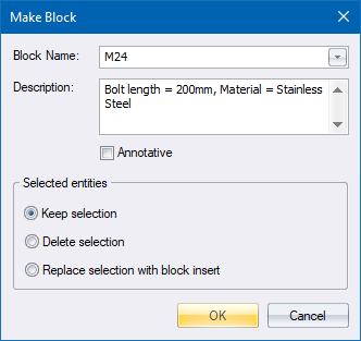 Select Delete selection if you want the selected entities to be removed from the drawing once the block is created.