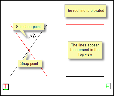 This Snap Mode snaps to the nearest intersection point between entities, as well as to the apparent intersection point of entities which appear to intersect such as entities at  different elevations which appear to intersect one another. This includes self-intersecting entities or between entities and geometry elements.