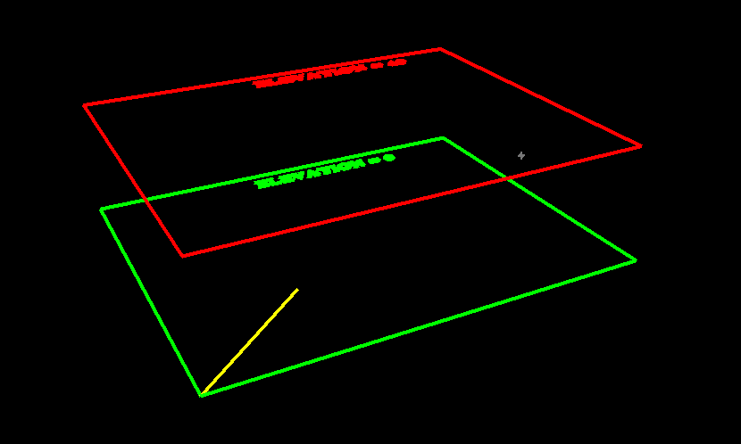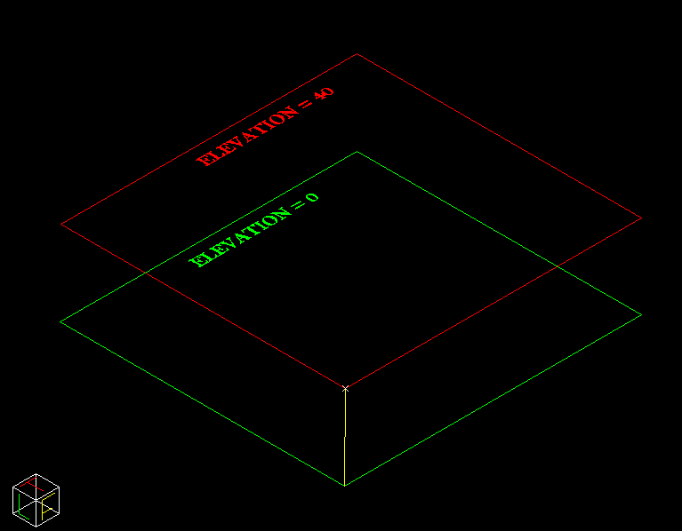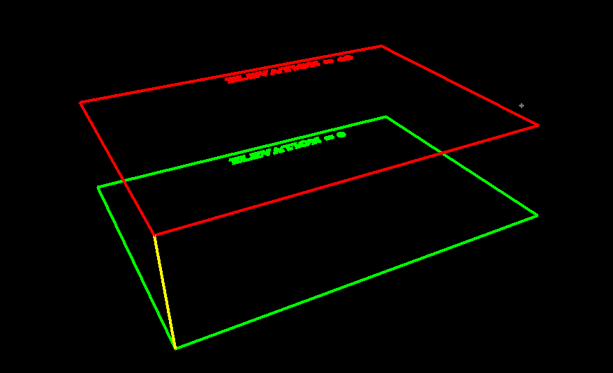 In the example below (SW Isometric View), we have disabled the 3D Jump option in System Settings. We have then drawn the yellow line from the green rectangle at elevation 0 to the red rectangle at elevation 40, by using the [J] key to jump to the corner of the green rectangle, then the corner of the red rectangle. From this view direction it looks like the yellow line correctly joins the green and red rectangles.