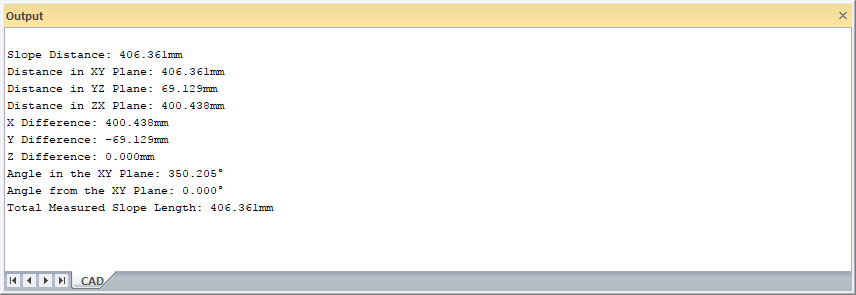 Use jumps or snaps to move to the next measure point accurately, and then press [Enter] or click over the point. The measurements are shown in the Output window.