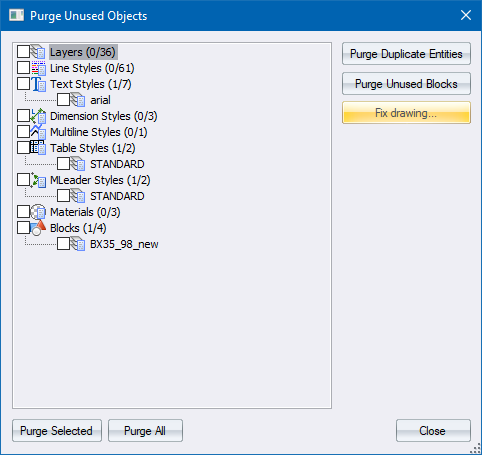 This function allows you to clean up the drawing by removing invalid geometry elements and fixing errors in styles and style references. Errors that can be detected and fixed are: