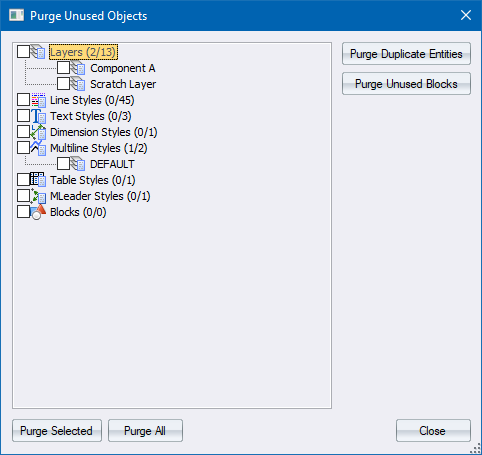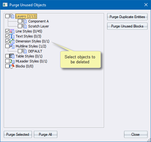 To purge only selected objects, you can select the objects from the objects list by clicking them. Alternatively, use press and hold [Shift] while you select a range of objects, or press and hold [Ctrl] while you select individual objects.