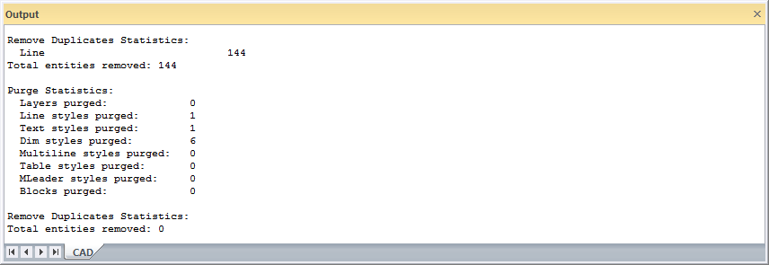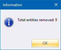This function allows you to remove duplicate entities from the drawing. The number of duplicates found and removed is displayed in the Output Bar.