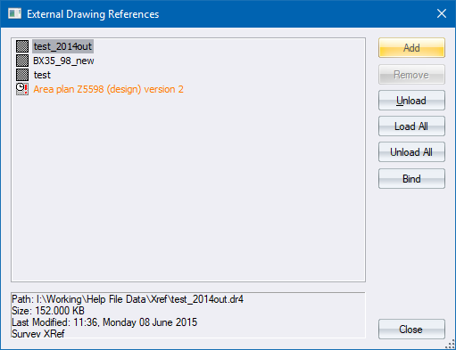 This function is used to manage (add, remove, unload, load all or unload all) the external drawing files.