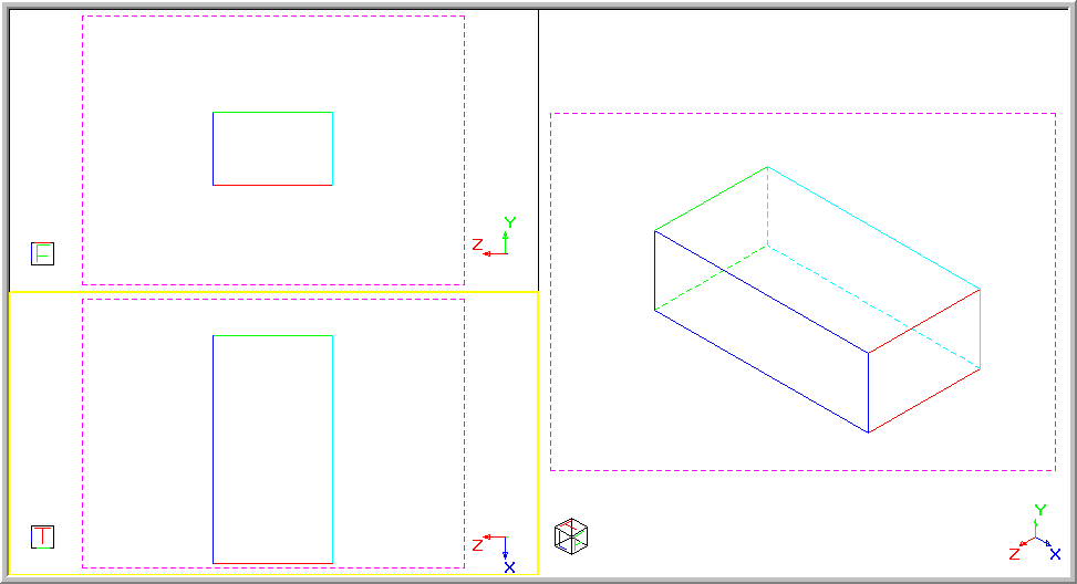 When drawing with multiple views, the active view is highlighted with a yellow border, as shown below where the bottom left view is active.