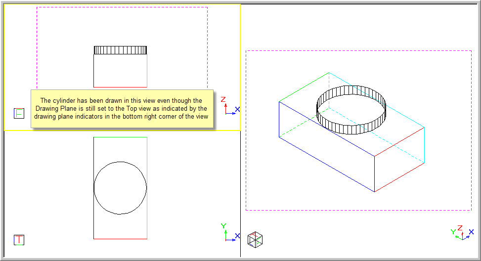 The top left view has now been activated. A cylinder is drawn and appears in the top view as that is the current drawing plane direction for the active view.