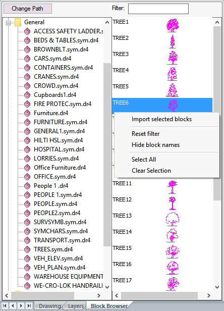 If you want to browse blocks from a different folder, click Change Path to select a new root folder for the Block Browser. The folders and DR4 files under the new root folder will be displayed in the Block Browser folder tree in the left pane.