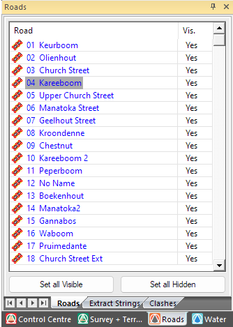 The road names display in this column and you can edit them as required. Road names will be displayed in blue if it is a Strings road or black if it is a Cross section road. Refer to Select Road File. The current road is highlighted in blue. |