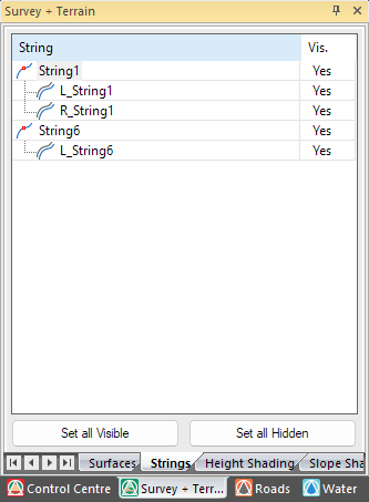You can control the strings that have been extracted from the CAD/DTM from the Control Centre. You can access the same functionality by selecting Alignment ► Regression ► Extract String but this page is just for convenience. From this page you can: