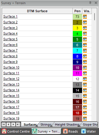 Toggles the visibility of this surface. Right-click the relevant cell to toggle between Yes and No. DTM points that are not visible cannot be selected in those functions which act on individual points. |