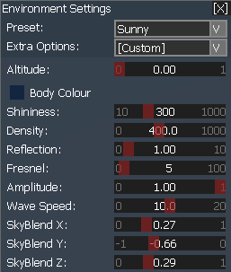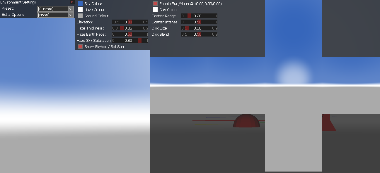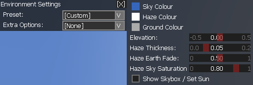 These options allow you to change the colour and style of the skybox. The skybox is a spherical structure, which can be divided into three parts - Sky, Haze and Ground. Each part can have a different colour and they are blended from top down to create a linear colour gradient.