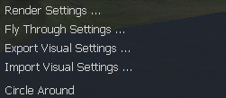 Opens a dialog box to help export/import the current visual and environmental settings, such as Skybox colours, ocean style, terrain mode, etc. This file (.vis) is actually a text file, and can be used to share the current Render View visual settings to multiple users. |