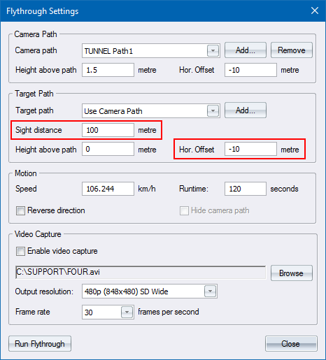 In Civil Designer, when you specify a Road as a camera path, the Road sight distance settings are used in the flythrough. The camera path and target path Horizontal offset may also be entered.