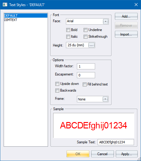 In the following example, the text height is specified as 25 du (drawing units) for both text items and dimensions.