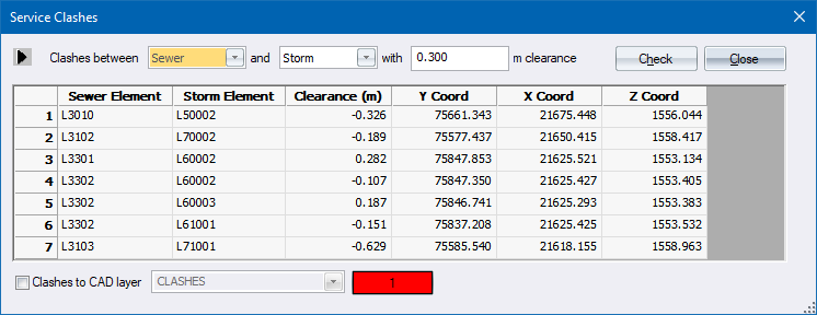 Select this checkbox to have the plan positions of the clashes drawn onto a CAD layer with the name, as entered in the text box. This makes it easy to identify the clash zones at a later stage. |