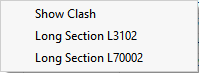 The Show Clash option positions the clash on the centre of the screen. The Long Section option opens the Longitudinal Section Editor and displays a long section of the chosen branch, as well as a symbol indicating the crossing service. |