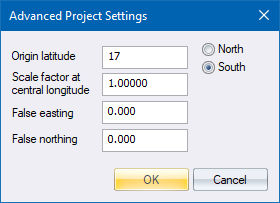 Enter the latitude on which the 0 value of the vertical ordinates of the coordinate system falls, and also select whether this latitude is North or South of 0° latitude (the Equator). This should normally be set to 0° (origin at the equator where North or South are immaterial) but could be different for some projections. |