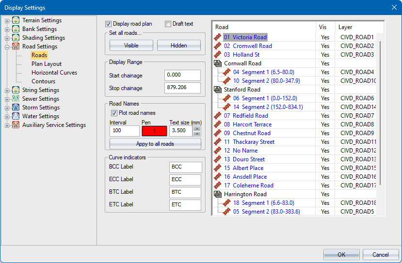 Set the visible status for each of the available roads. Enter either Yes or No in the desired cell; or right-click the cell to toggle the current setting. |